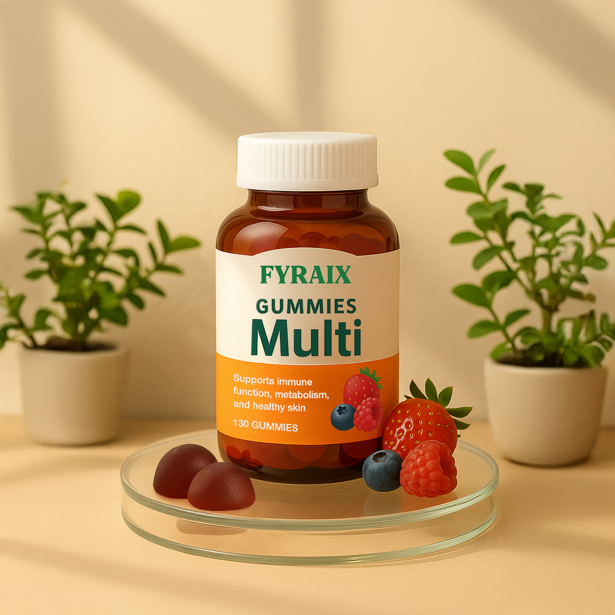 Fyraix Multivitamin Gummies for Adults deliver a nutritionally balanced formula containing vitamins A, B3, B5, B6, B12, C, D3, E, Biotin and Folic acid plus important minerals to satisfy your daily vitamin needs. Fyraix gummies are Non-GMO and contain no aspartame, gluten, lactose, artificial colours, flavours, or preservatives.